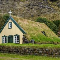 この教会は地面に半分埋まった形の建物で屋根もすっぽり芝で覆われています。